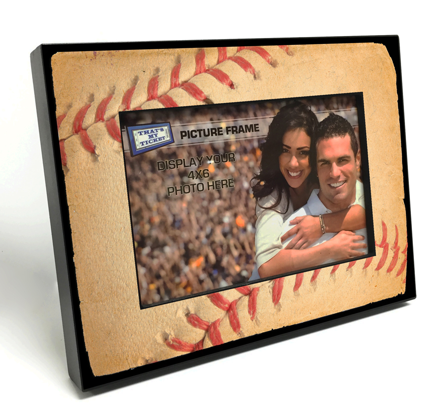 A high resolution vintage baseball image is featured adhered to a 1-inch thick 4x6 wood picture frame with black edges. It includes a glass photo cover and a hinged easel back for desktop display. Overall size: 6 (H) x 8 (W) x 1 (D). (Viewable size of photo opening is 3.5 x 5.5)